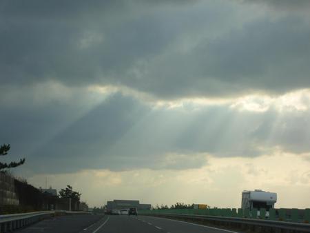 ③こちらは、金沢から北陸道を南下している時の空。雲間から太陽の光が放射状に伸びています。光芒と呼ぶそうですが、ヨーロッパでは「天使の梯子」とも言うそうな。たまに見ること、ありますよね(^-^)