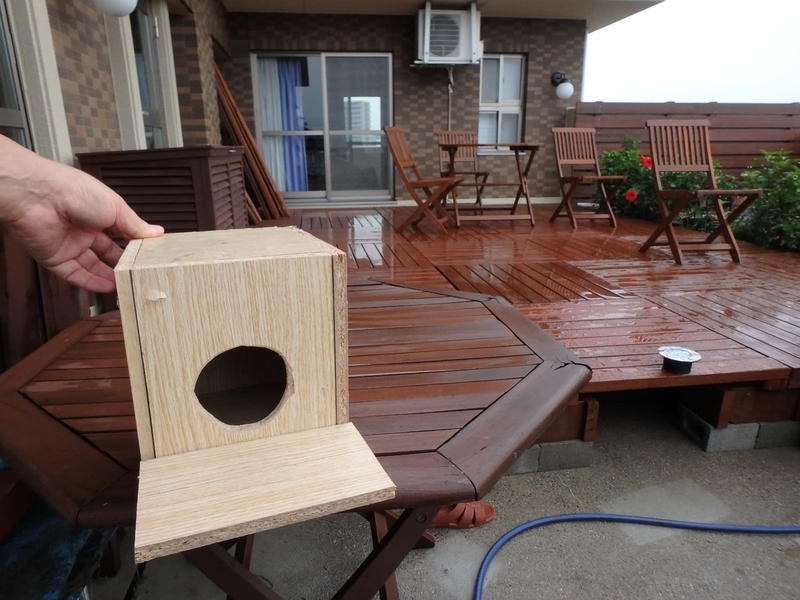エアコンの室外機に巣を作っていたスズメのために、豪邸()を作ってあげました。