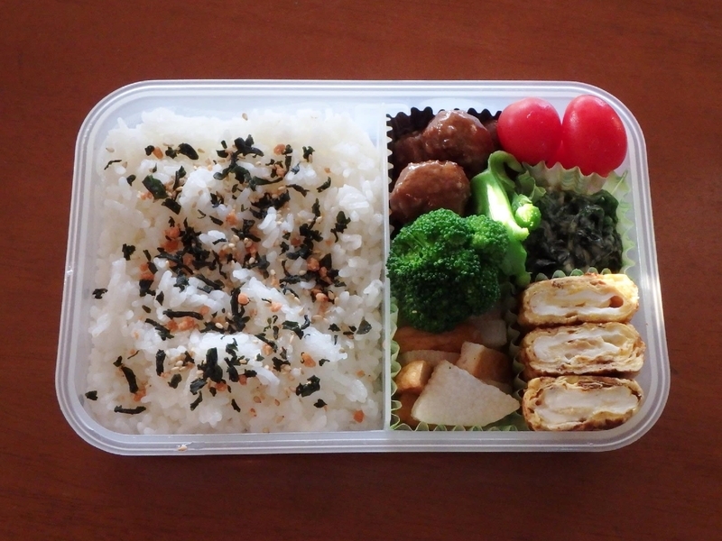 前日の晩御飯のおかず2種と、冷凍じゃないけどできあいのミートボールを駆使したミートボール弁当(笑)
