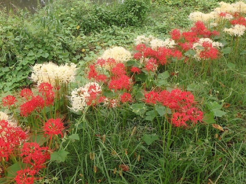ヒガンバナって、墓地の近くに植えられていたり「シビトバナ」という別名もあったりちょっと不気味な感じもする花ですが、こうやって赤花と白花が咲き乱れていると。。。紅白でおめでたい感じ(笑)