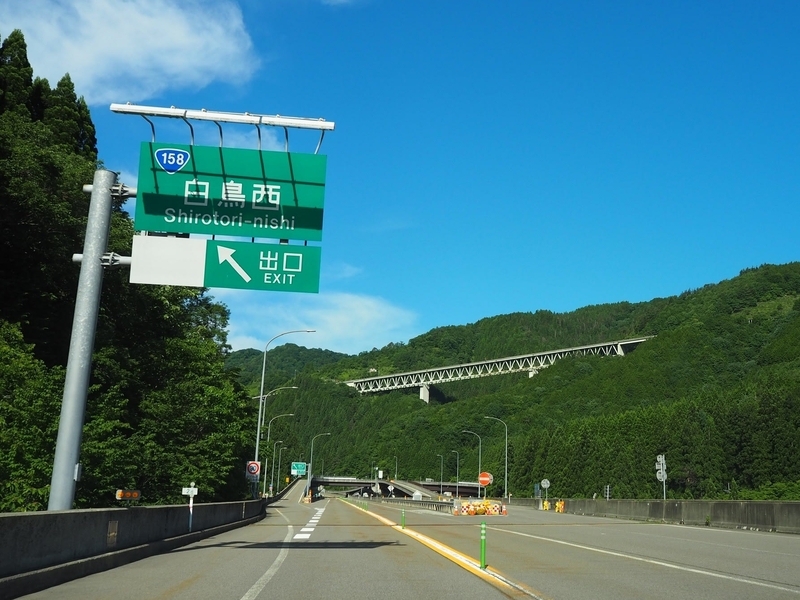 白鳥西IC。大きなループ状の道路を走って奥に見える道路へと高低差を登っていきます。